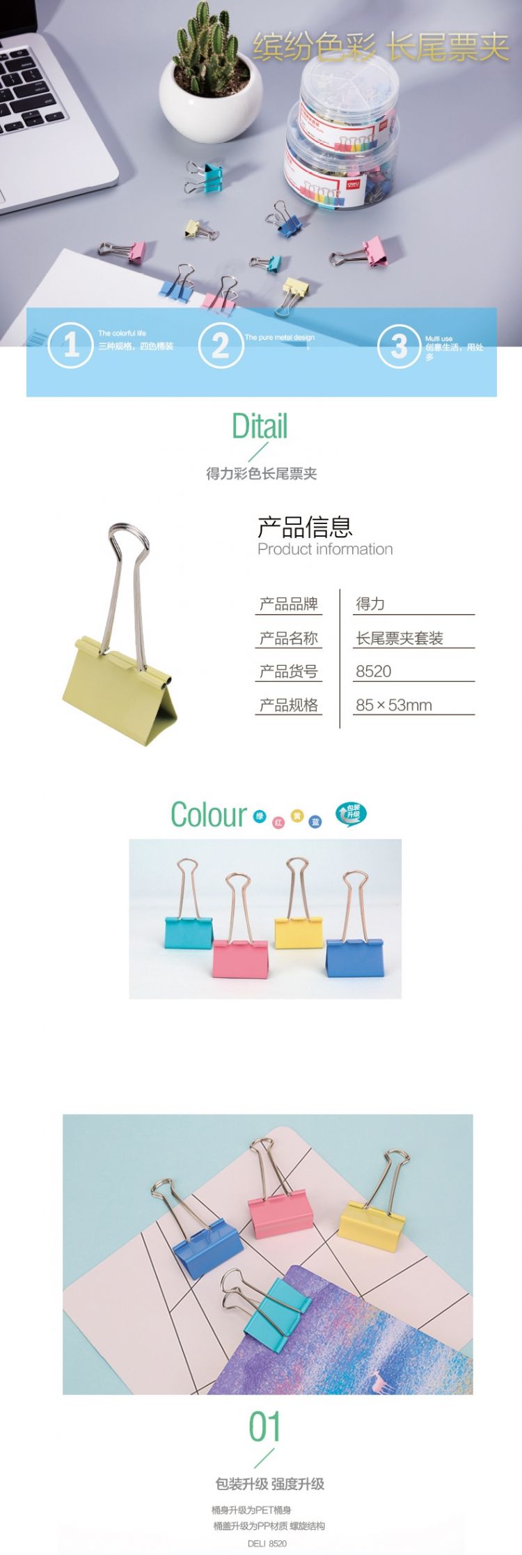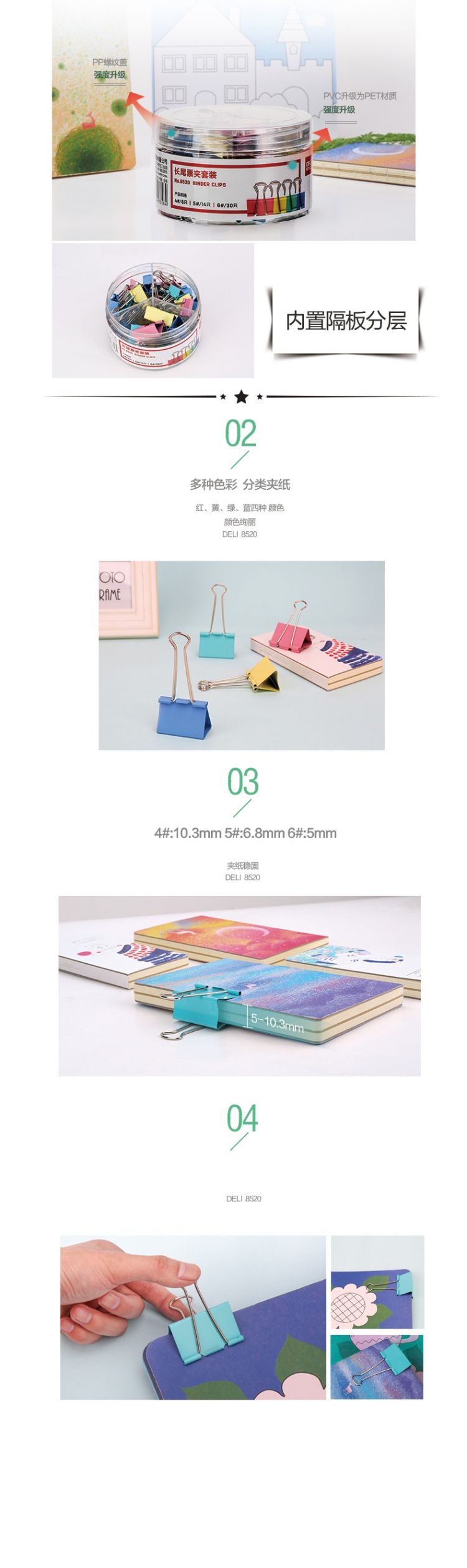 得力(deli) 长尾票夹套装 8520 50只/筒 内含4mm*6只 5mm*14只 6mm*30只 混色
